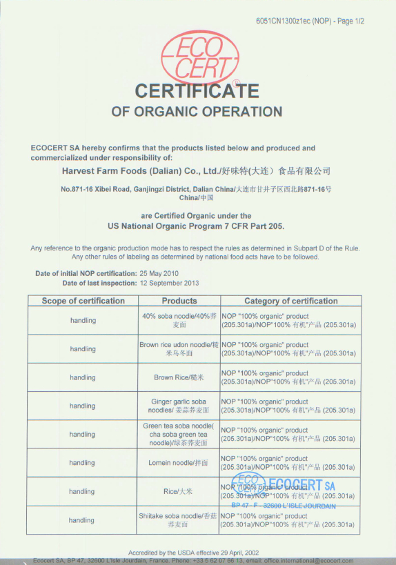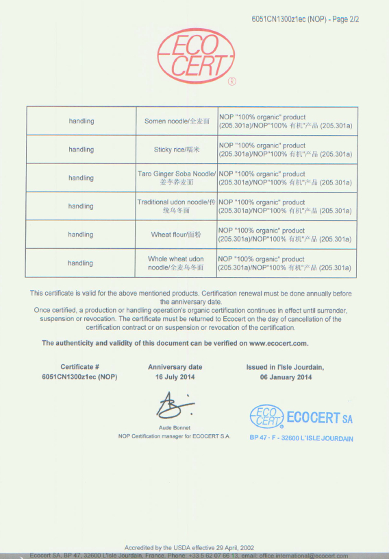ORGANIC CERTIFICATE NOODLES(NOP)